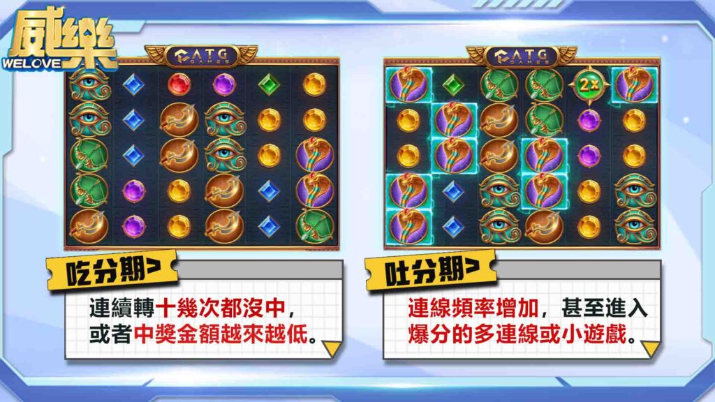 吃分期,就是機台把玩家投進去的錢收集起來,這時你會發現轉起來特別乾、連線稀少,中獎額度也不高;吐分期則剛好相反,中獎機率明顯提升,甚至會出現連線、進入免費遊戲或爆分畫面。