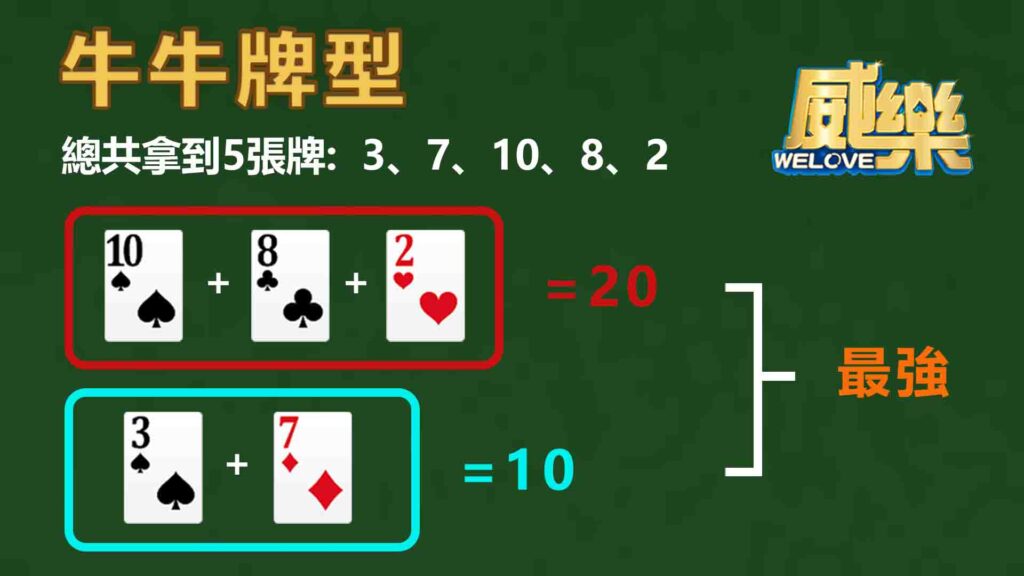 - 牛牛:最常見的大牌型,等於滿分。