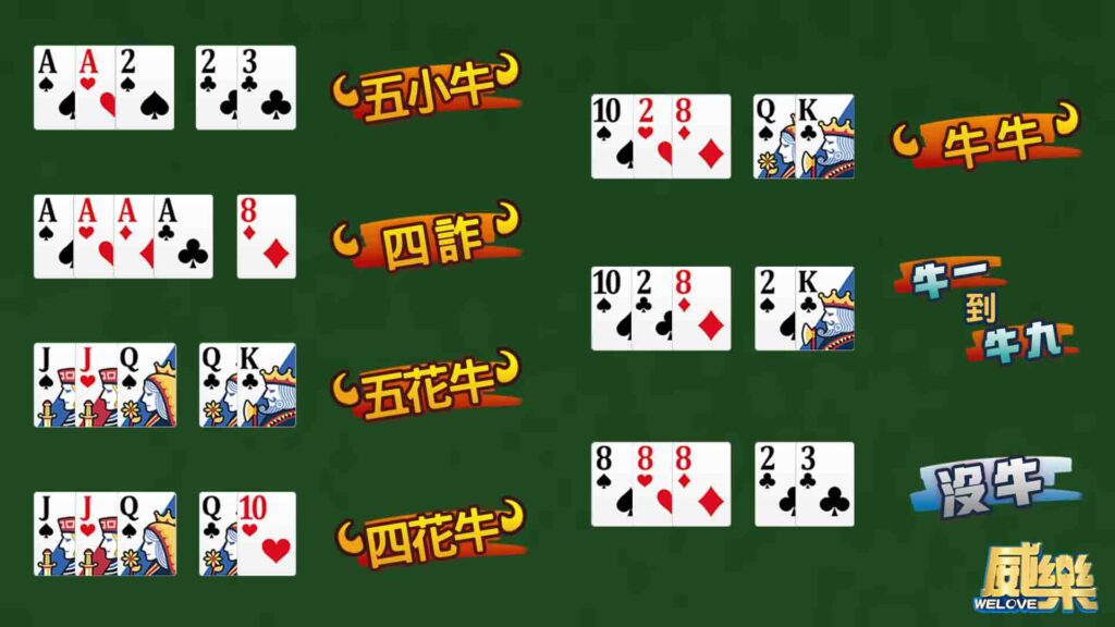 - 牛九到牛一:剩下兩張點數決定的結果,數字越大越強。