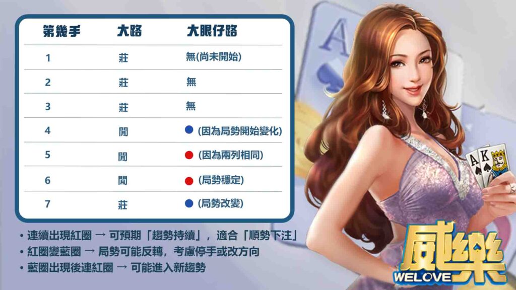 大路很長但副路轉色 → 可能準備反轉。這時候先觀察一局,再決定是否跟牌。