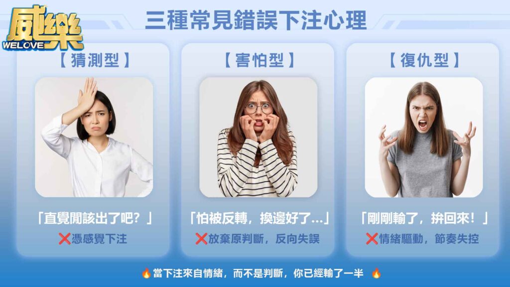 當你太想贏、太怕輸,下注的那一刻就會開始動搖。例如明明看好莊,但怕被反轉就壓了閒,結果又懊悔。小編建議可以在下注前先「寫下當前局勢與決策理由」,培養每一次下注都來自理性判斷而非臨場感覺,長期下來會大幅提升準確度。