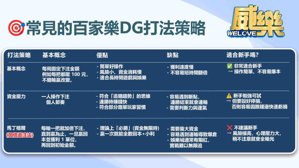 說到打法,最常被提到的就是下注策略。小編幫大家整理了三種常見的 DG 百家樂打法: