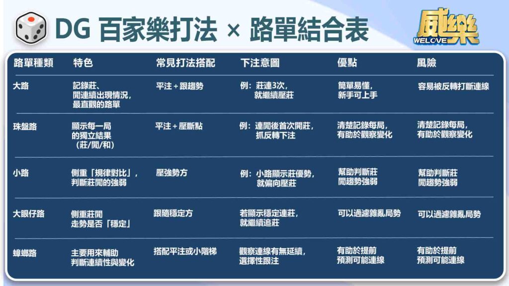 很多老玩家都說,想提升勝率就一定要「看路」。DG 平台裡常見的路單有大路、珠盤路、小路等等。這些路單的重點就是幫助你觀察莊閒的出牌規律,然後搭配打法下注。