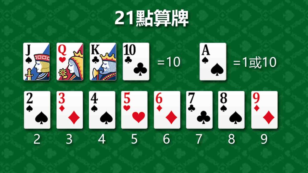 在進入算牌之前,小編先為各位簡單科普 21點規則,因為規則沒搞懂,算牌再熟也很難發揮。21點的目標很簡單:你要讓點數越接近 21 越好,但一超過就直接爆掉。牌面點數的算法也不難,2~10 就照數字算,J、Q、K 都算 10 點,A 則可以算 1 或 11(哪個不爆就算哪個)。為了讓新手更快理解,小編也把最常見的 21點規則整理成一個簡單表格: